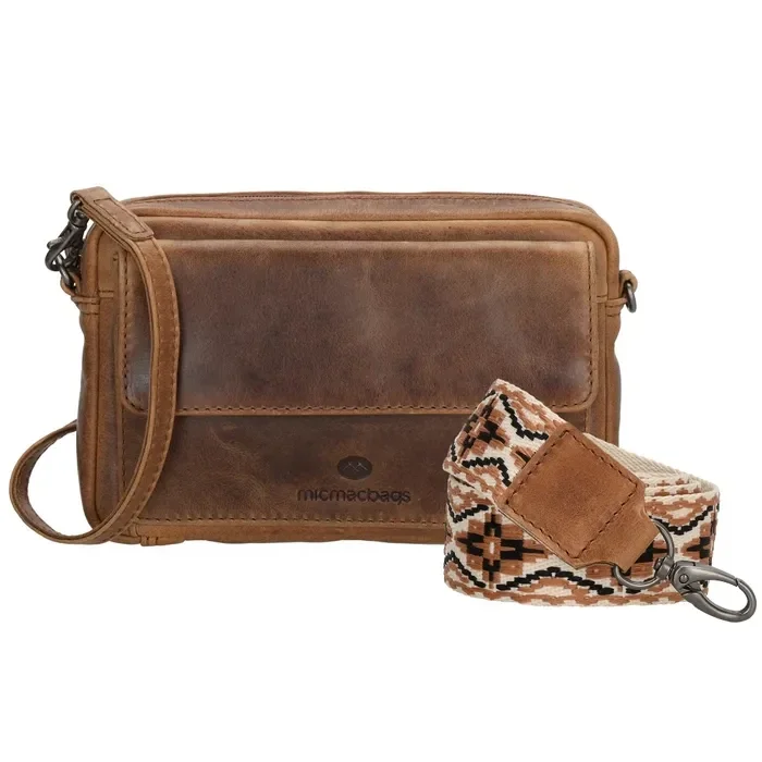 De tas wordt geleverd met twee verstelbare schouderbanden: één neutraal (leer, in de kleur van de tas) en één met die prachtige Navalo print.