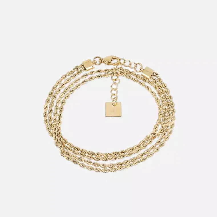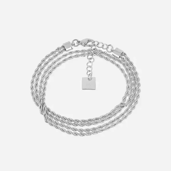 De armband bestaat uit 2 x 2 lijnen en oogt daarom op de pols als een set van vier gelijke armbandjes. Verkrijgbaar in zilverkleur of goldplated.