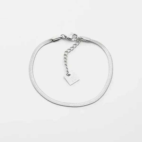 Deze armband met een platte "snake" schakel is gemaakt van hypoallergeen edelstaal. Beschikbaar in zilverkleur en goldplated.