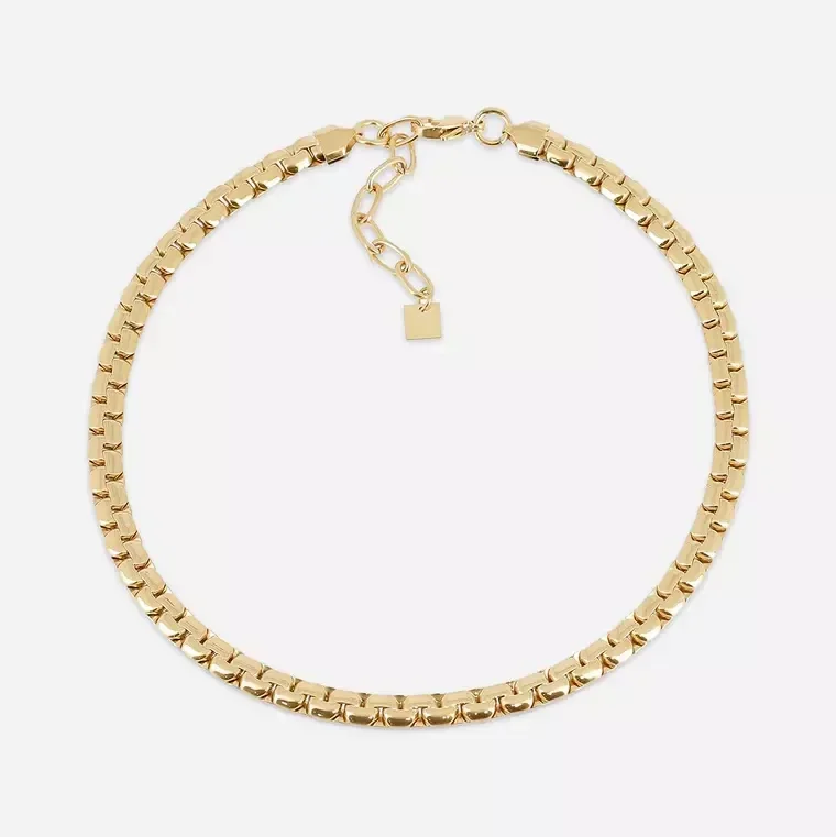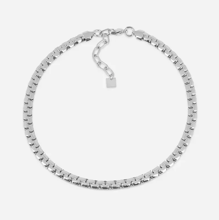 Deze ketting met een platte schakel is gemaakt van hypoallergeen edelstaal. Beschikbaar in zilverkleur en goldplated.