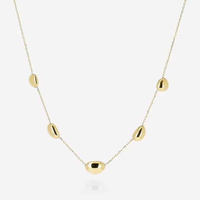 Deze ketting van hypoallergeen edelstaal wordt op enkele plaatsen onderbroken door een opvallend tussenzetsel met ovaalronde vormen. De ketting is beschikbaar in zilverkleur zowel als goldplated.