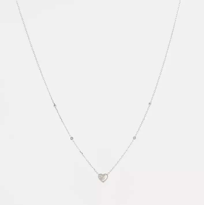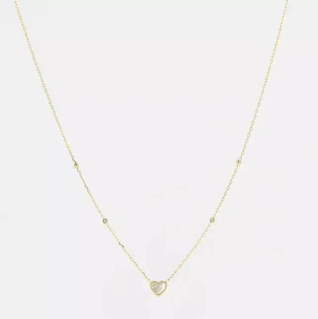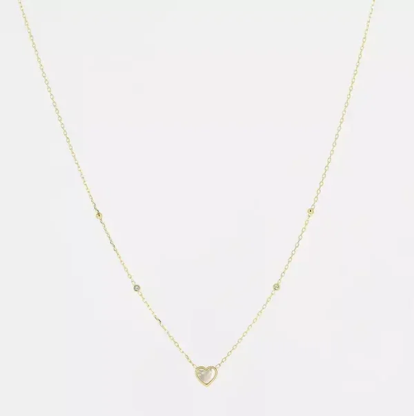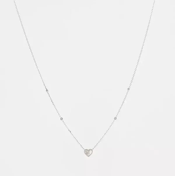 Deze ketting is gemaakt van hypoallergeen edelstaal en wordt op enkele plaatsen onderbroken door een subtiele zirkona. Het hangertje is een klein hart dat ingelegd is met parelmoer. De ketting is verkrijgbaar in zilverkleur zowel als goldplated.