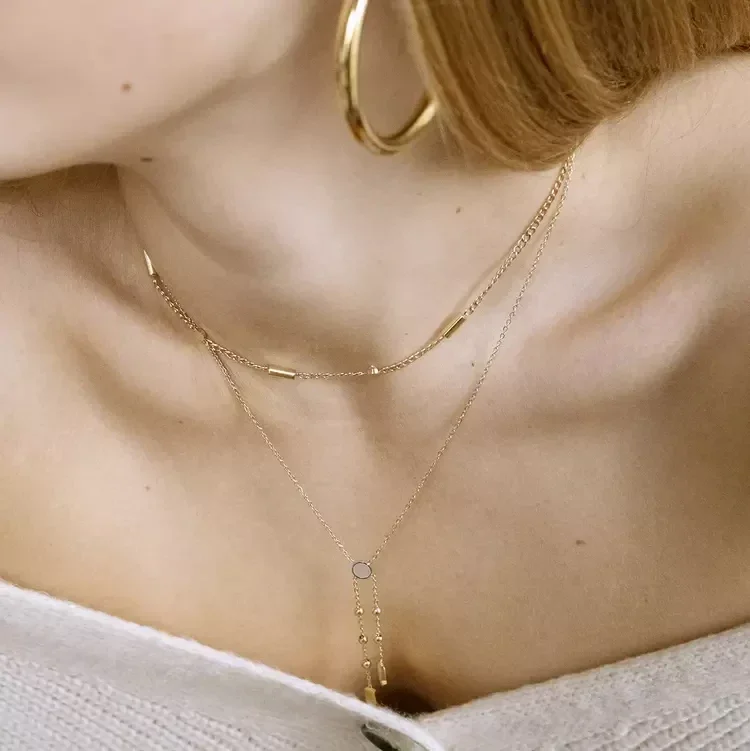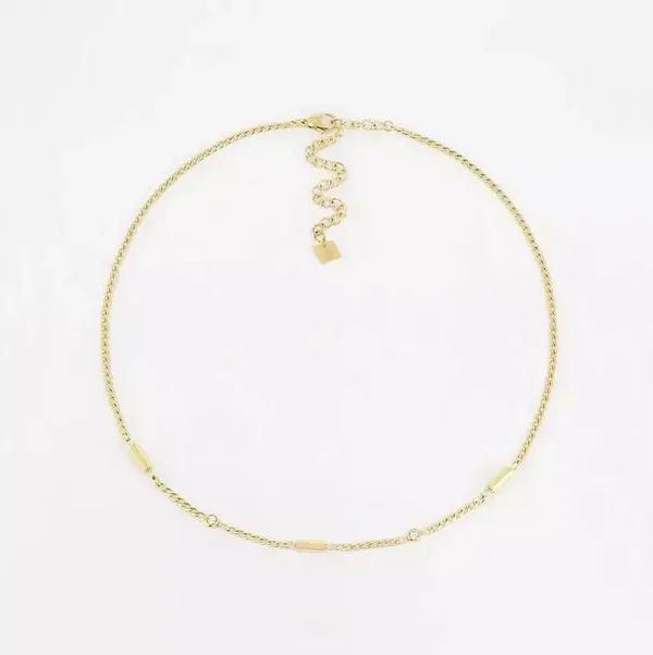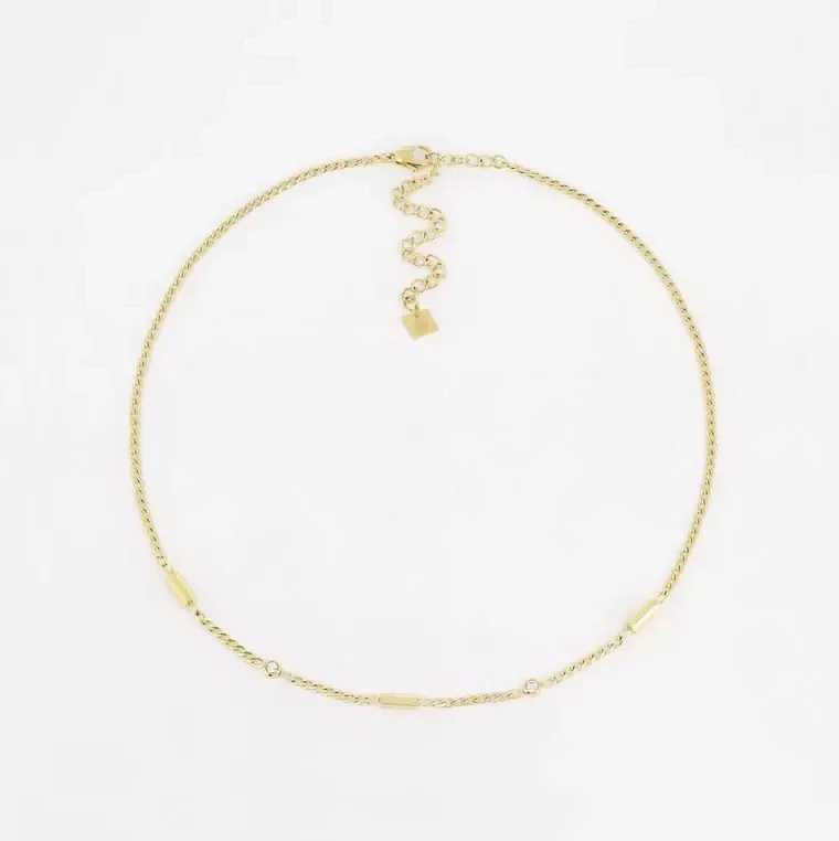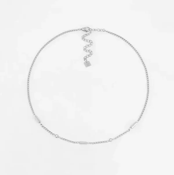 Deze ketting is gemaakt van hypoallergeen edelstaal. De schakeltjes worden op meerdere plaatsen onderbroken door een balkje of een subtiele zirkonia. De ketting is verkrijgbaar in zilverkleur zowel als goldplated.