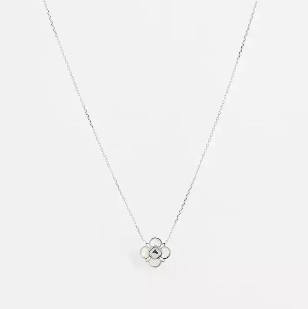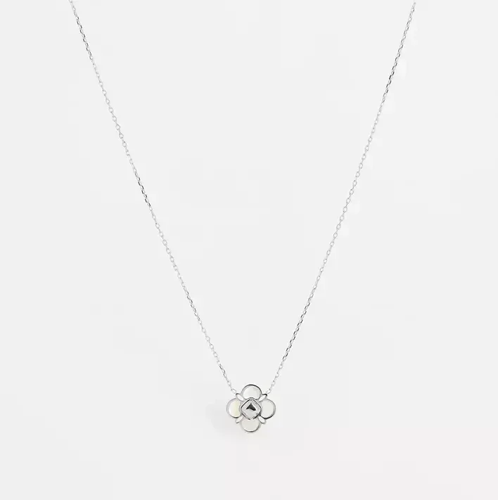 Deze ketting is gemaakt van hypoallergeen edelstaal. De hanger in bloemvorm is ingelegd met parelmoer. Verkrijgbaar in zilverkleur zowel als goldplated.