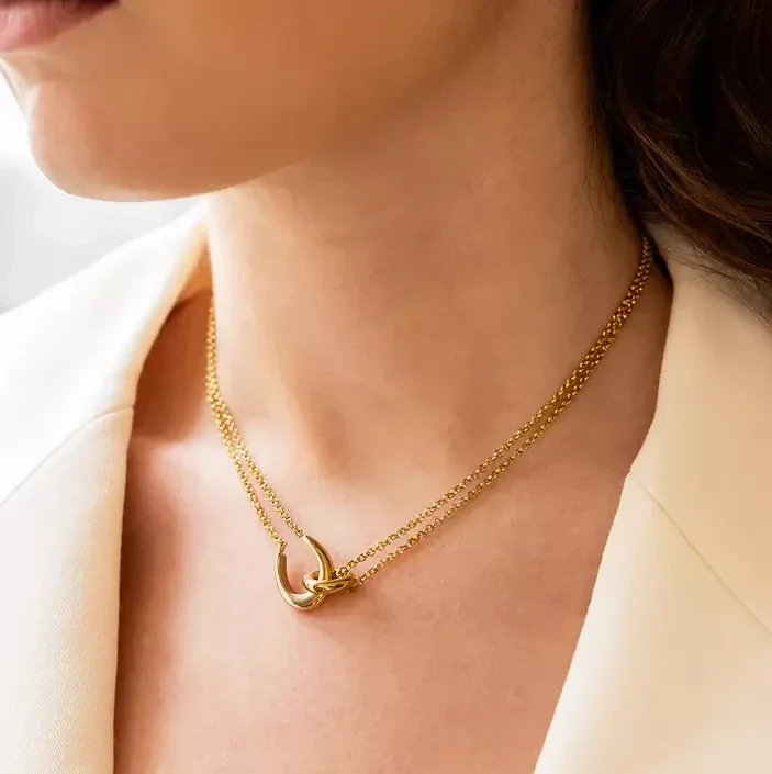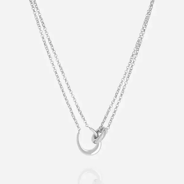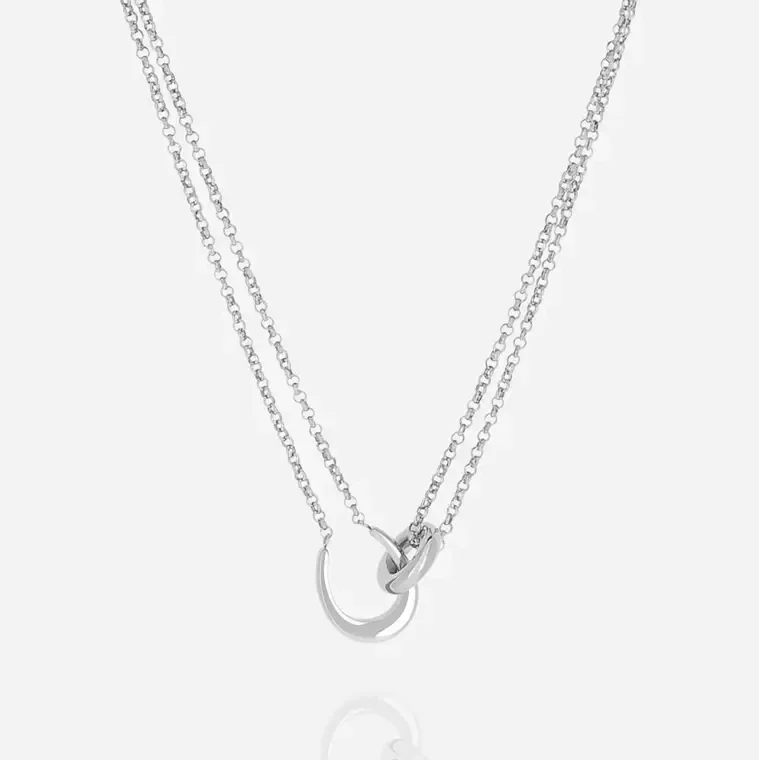Deze ketting met opvallende hanger uit twee delen, is gemaakt van edelstaal.