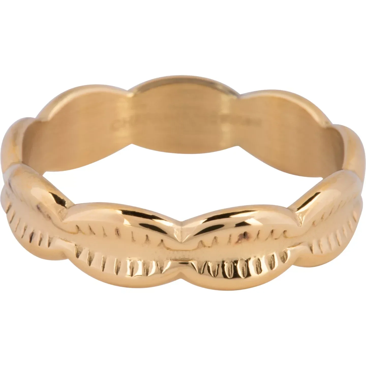 Deze (stapel)ring is gemaakt van goldplated, hypoallergeen edelstaal met een motief van Kauri schelpen en is verkrijgbaar in verschillende ringmaten: