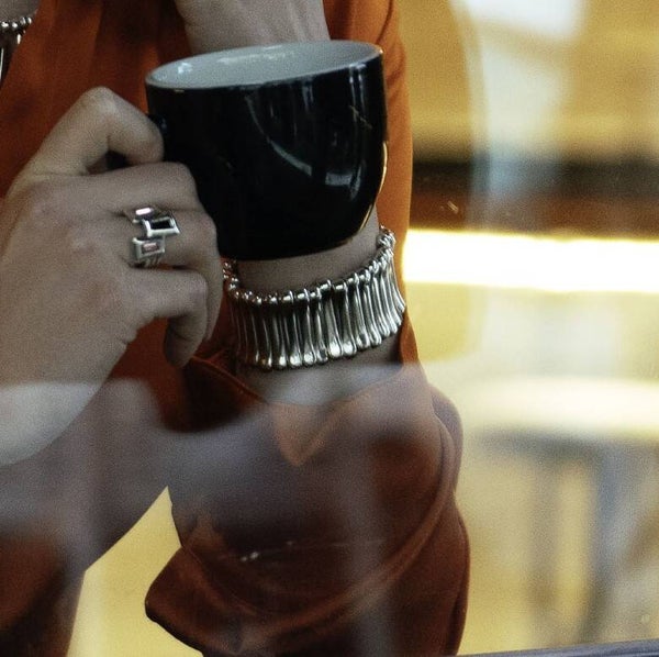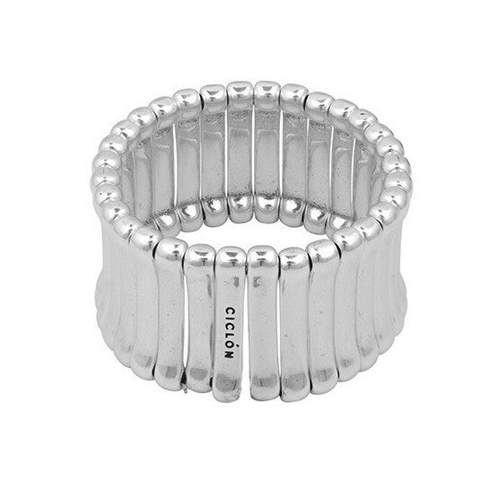 Deze brede, elastische Ciclón statement armband is gemaakt van 15 micron verzilverd metaal. De armband is geschikt voor polsmaat 17,5 tot 19 cm. Op een sieraad van Ciclón krijg je twee jaar garantie.