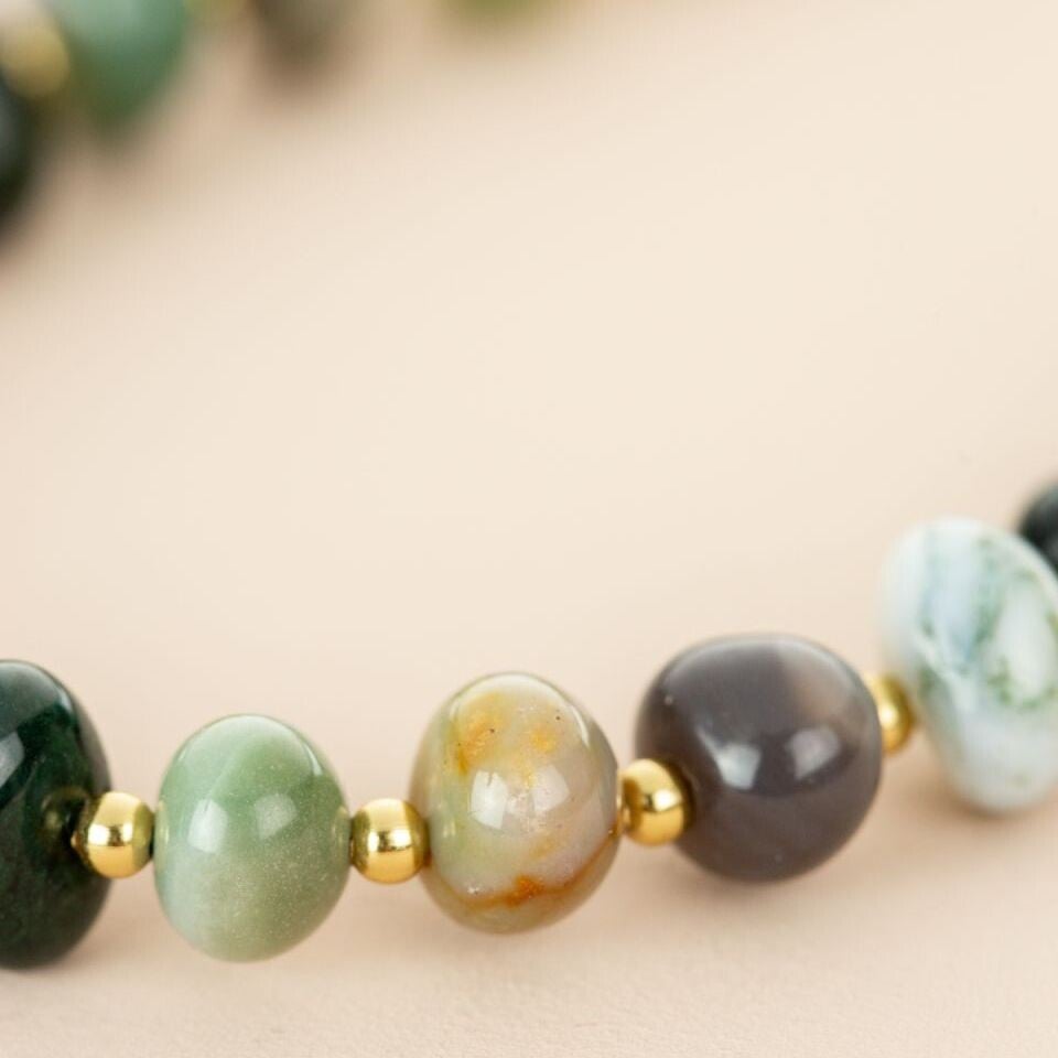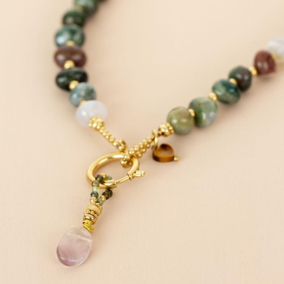 Deze korte ketting (ca. 42 cm) van My Heritage is gemaakt van goldplated edelstaal en een hoogwaardige kwaliteit natuursteen/edelsteen. Steen: rustiek Mosagaat