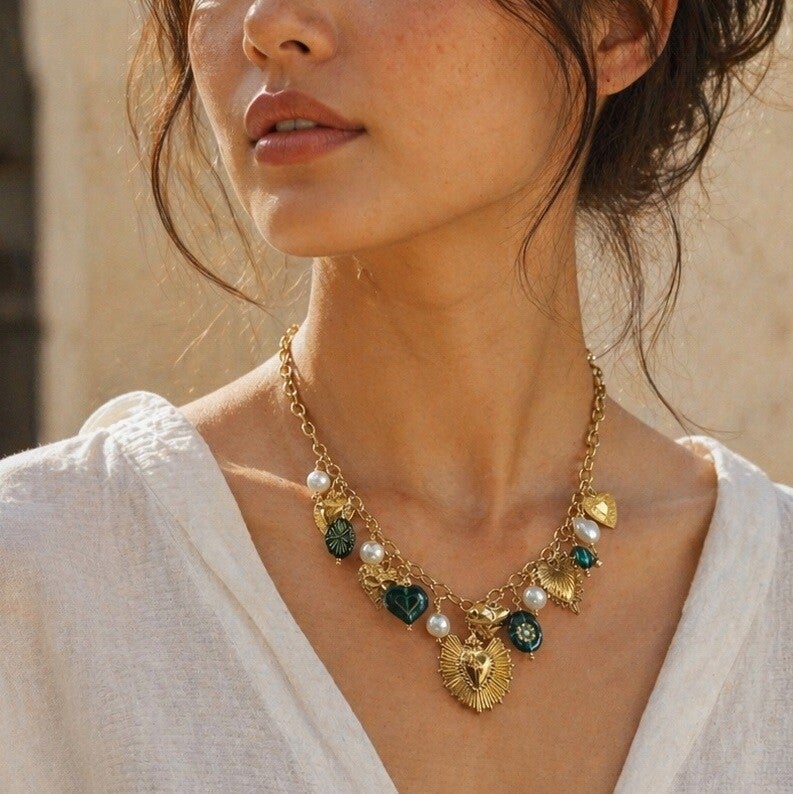 Uit de collectie Sunkissed: deze bedelketting is gemaakt van hypoallergeen, goldplated edelstaal met bedels van zoetwaterparel, edelstaal en resin.Lengte: ca. 42 cm + 5 cm verlengketting