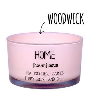 My Flame geurkaars in herbruikbaar glas, gemaakt van biologische, duurzaam geteelde sojawas met een natuurlijke houten lont. De buitenkant van het glas is voorzien van de tekst 'home'.